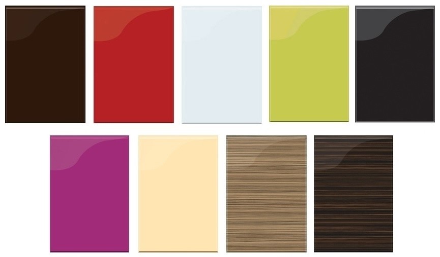 В основе фасадов для кухонного гарнитура из крашенного МДФ лежит использование плит МДФ, которые предварительно окрашивают специальной мебельной эмалью, а в конце покрывают специальным лаком, придающим фасаду характерный глянец. По желанию заказчика эмаль может быть глянцевой, матовой, перламутровой и иметь эффект металлик. Плюсы крашенного МДФ: высокая эстетичность, большой выбор фактур и оттенков, возможность проводить реставрационные работы при небольших повреждениях. Минусы крашенного МДФ: неустойчивость к высоким температурам и солнечным лучам, быстрое появление царапин в результате механического воздействия и использования средств, содержащих абразивы и щелочные компоненты, невозможность применять любые средства для ухода.